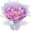 Уменьшенный: диантус фиолетовый - 1 шт., хризантема кустовая ромашковая фиолетовая - 1 шт., кустовая роза фиолетовая - 1 шт., статица, лимониум, упаковка, лента.
